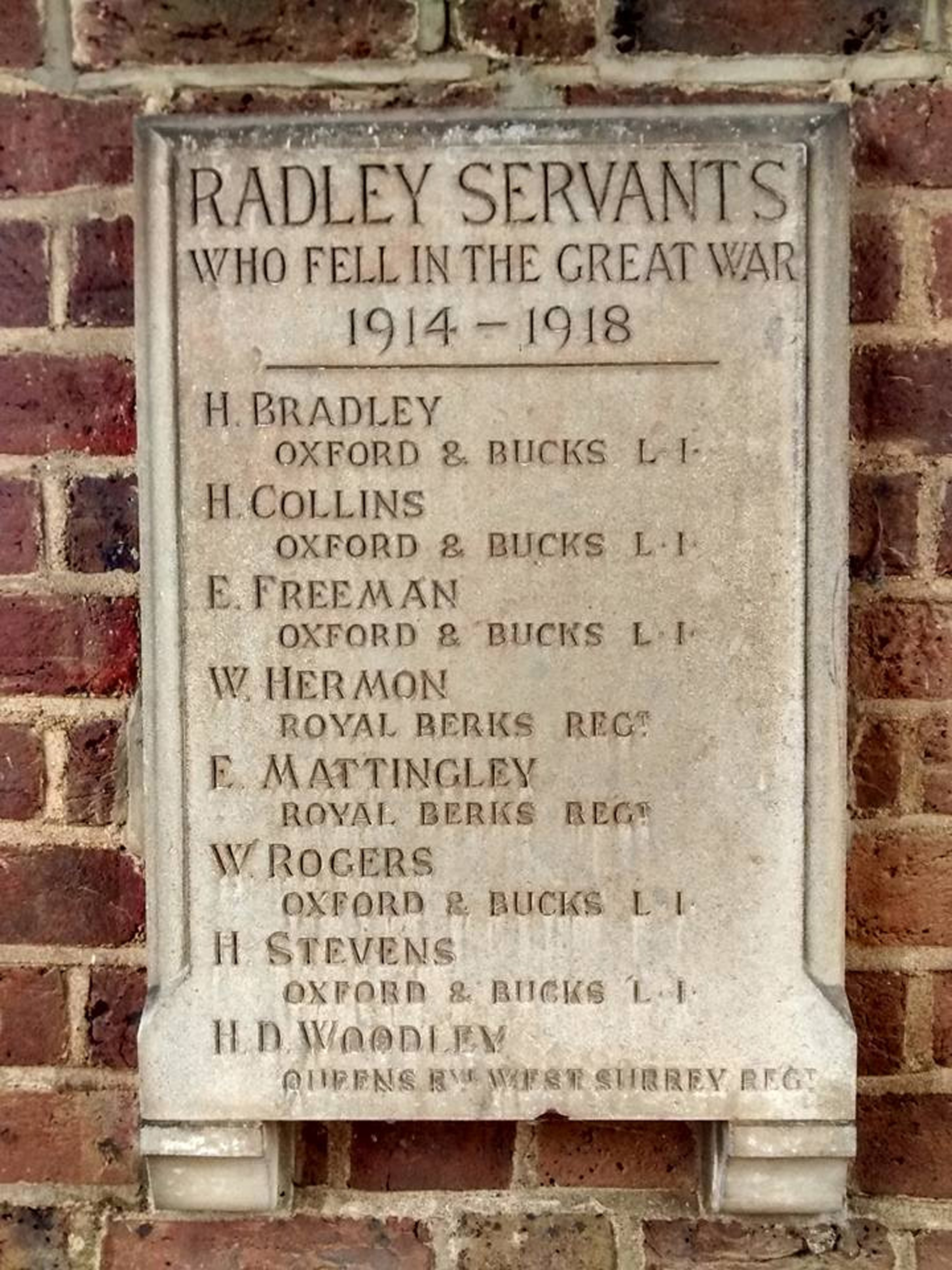 | This is a highly contentious carving. Not only does the word ‘servants’ evoke the class distinctions of the Edwardian era, but the very separation of this group of names on the War Memorial reinforces that separation in contemporary eyes. Yet when it was created it was as an act of deep reverence and honour. Radley is one of very few schools which included the serving staff on its War Memorial. At its dedication in 1924 it was part of the great democratisation in death which saw the creation of the Imperial (now Commonwealth) War Graves Commission at the end of World War 1.
