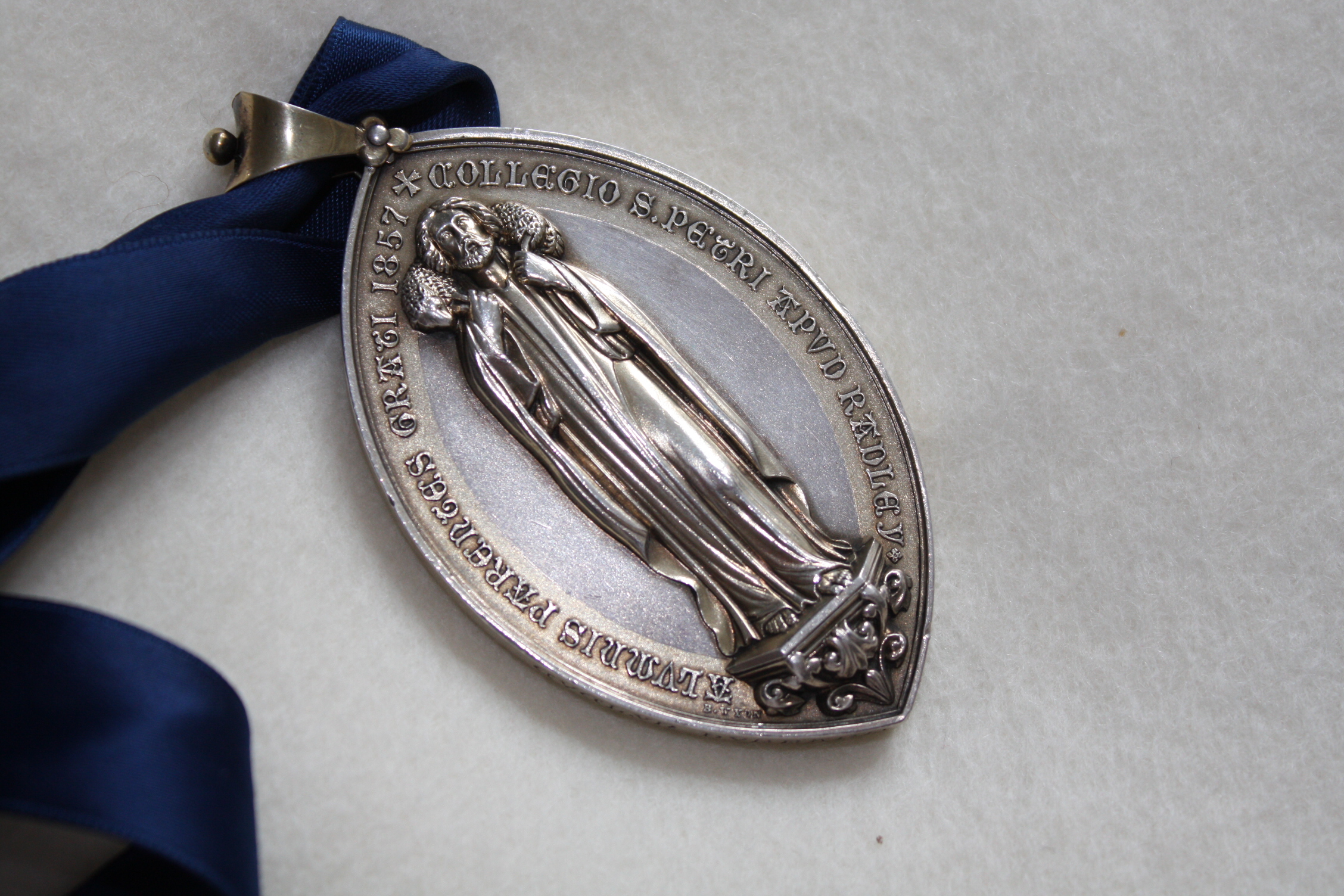The medal was designed by Edward Howard, one of the first three schoolmasters of Radley. Howard, as the son of a member of Royal Academy, was considered the artist on the staff, and commissioned to design the school seal, which was executed by Strong-i-th’-arm in London, and represented a ‘dove standing on a scroll, held in her bill.’ The reverse of the Richards Gold Medal similarly represents a dove with a scroll, but added the serpent as well, and is the earliest reference to the school motto ‘sicut serpents, sicut columbae.’ [Be as wise as serpents, as gentle as doves]. The design on the obverse which represents the Good Shepherd (occasionally described as St Peter) was also used in the earliest Radley bookplates and on the Radleian magazine from 1864 until the 1960s. Edward Howard also designed Clock Tower.