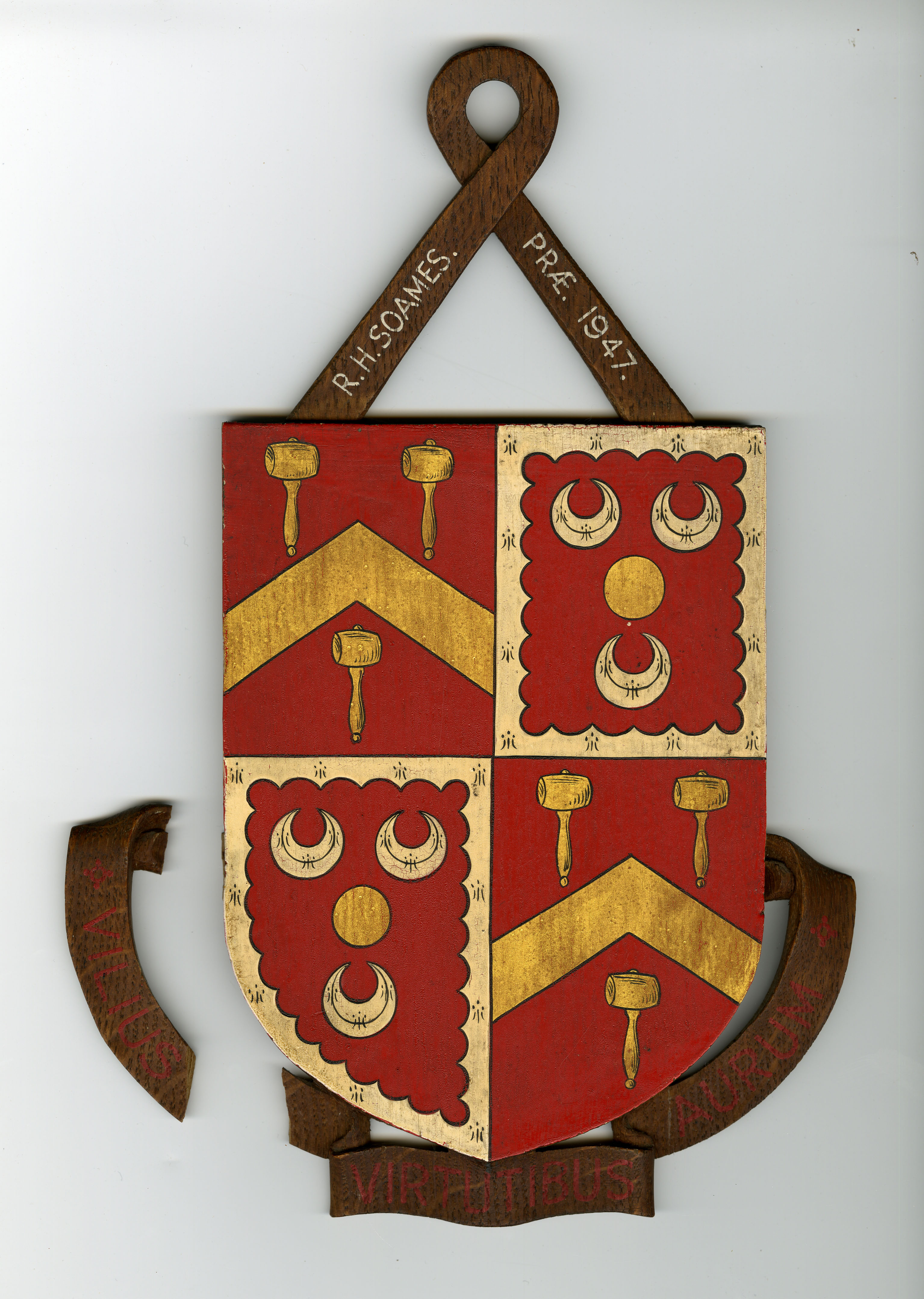 This individual shield was put up by Robert Harold Soames of G Social, in 1947/8. Robert Soames was born in 1929, the son of Lt-Col. AA Soames, DSO, and came to Radley aged 13 at the height of World War 2 in September 1942. He played cricket for the first XI in 1946, and represented the school at fives. He was a prefect. On leaving school in 1947, according to a custom dating back almost a century, he arranged for this copy of his family’s coat of arms to be hung in the Dining Hall, as was his privilege as a prefect.