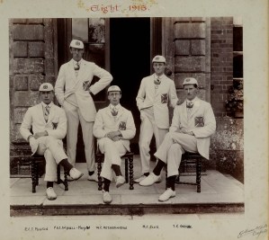 Organised sport has been central to the life of Radley from the foundation of the school in 1847 when the earliest Fellows included two (Howard and Savory) chosen specifically because they could participate in cricket and boating with the boys. 2016 saw a new development in Radley sport with the appointment of James Gaunt as Director of Sport and the subsequent creation of a Sports Office located on one of the main thoroughfares of the school between Shop and Clocktower. The new office is shared by the Director of Sport and some of the specialist sports coaches, who include Old Radleian, Nick Wood, formerly of Gloucester Rugby, Olympic rower, Sam Townsend, Hockey Professional Peter Bennett and Cricketer Andy Wagner. But sport already had a long and distinguished career at Radley College and, being keen to uphold and honour that tradition, a decision was taken to decorate the office. Masterminded by James Rock, the Rackets coach, the sports coaches delved through the Archives to identify key moments in Radley sporting history. They created a timeline which wraps around the room, against a backdrop of world events, and, in the Director of Sport’s office, a wallpaper which is a montage of the many ordinary moments in a school’s sporting life. From sinking boats to early PT, from world champions to the Bash Street Kids, – through the magic of digitisation, all sporting life is here …