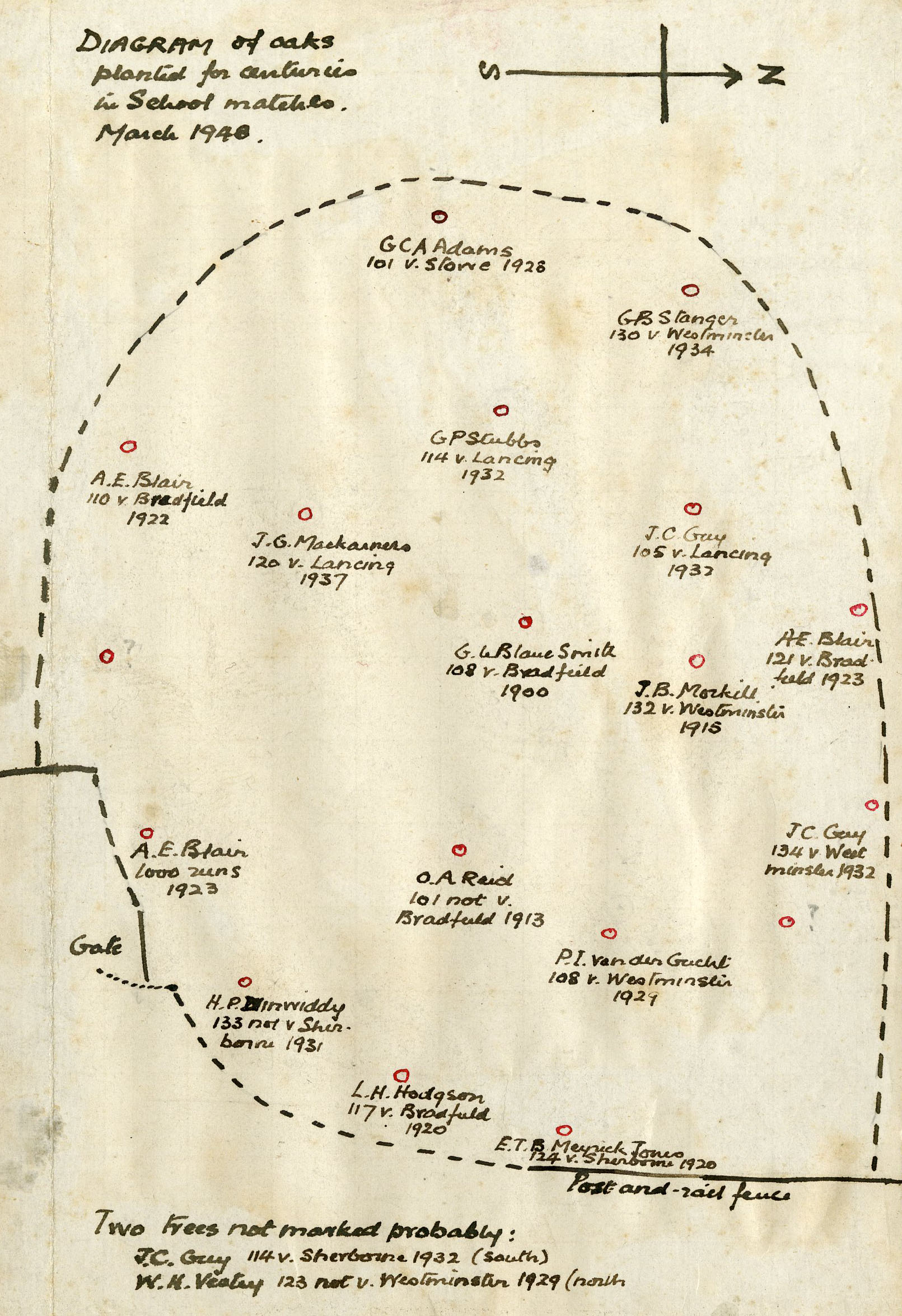 ![]() 1948. The last tree to be planted at Century Clump. Each oak commemorates a Century scored in a school match. Cricket at Radley |