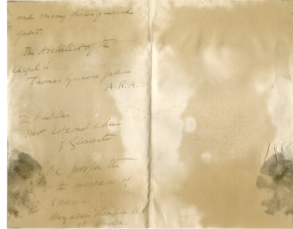 A.M.D.G. [Ad maiorem gloriam Dei – To the greater glory of God]. The Foundation Stone of this Chapel was laid on St Andrew’s Day 1893 by William Stubbs, DD, Bishop of Oxford and Visitor of this College in the presence of Henry Barnett Esq of Glympton Park, Chairman of the Council. The Lord Addington, the Revd W.W. Jackson DD, Rector of Exeter College, Oxford (members of the Council) and many distinguished guests. The Architect of the Chapel is Thomas Graham Jackson, ARA. The Builders Messrs Estcourt & Son of Gloucester. May God prosper the work to the increase of His Church. Henry Lewis Thompson, MA, Warden