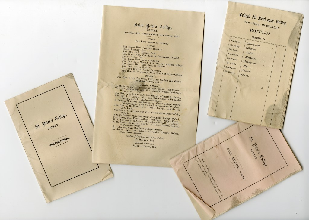 It contained five documents. Only one of them is unique. The other four were all copies of printed leaflets that were widely circulated: we still have copies of each of them in the school archives. First was the school roll ‘Rotulus’, which contained the name of every boy in the school in Michaelmas Term 1893, arranged by class, with the name of their Social Tutor. Second was a copy of the school rules. Third a booklet laying out the powers and privileges of the prefects. Fourth the prospectus. Between them, these documents summarise Radley College – what it is, what it is for, who it is.
